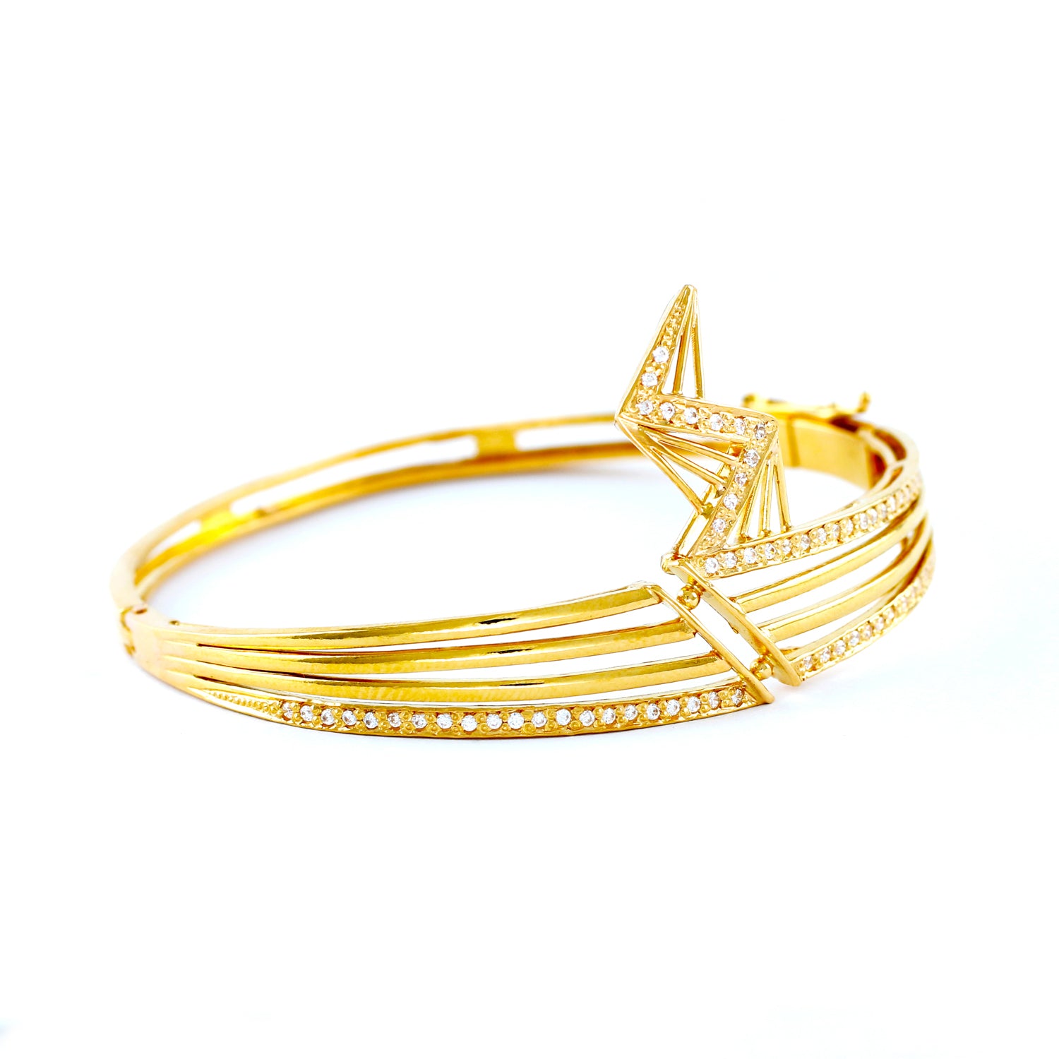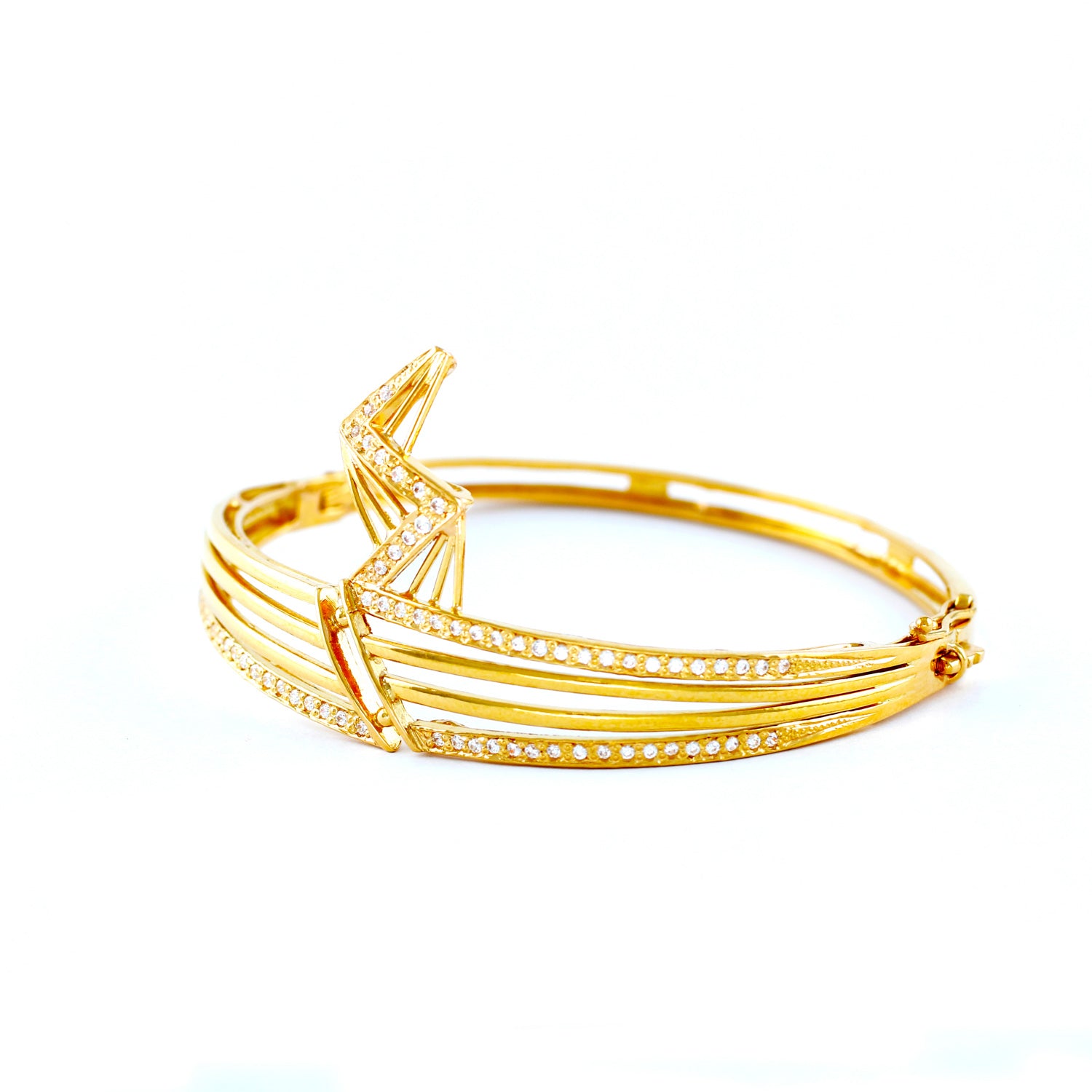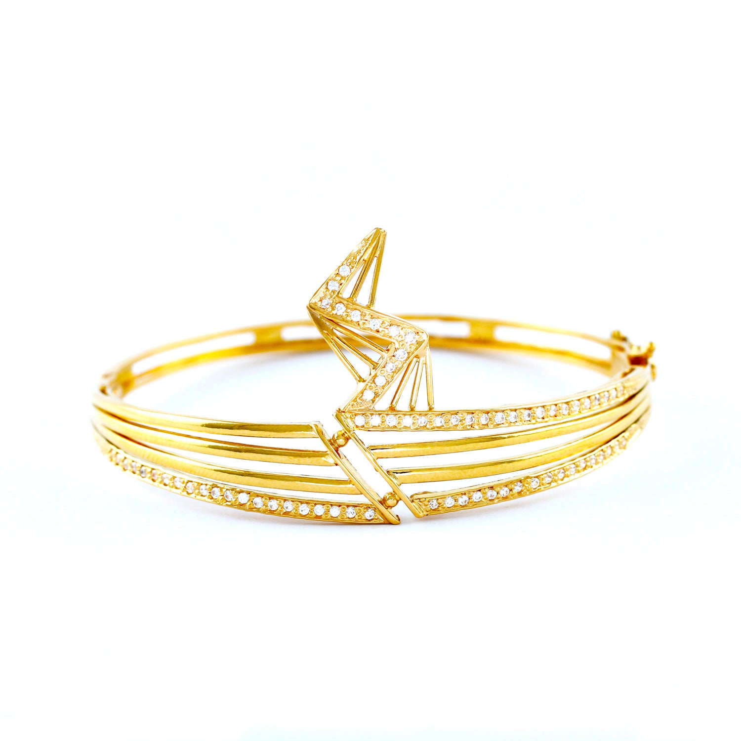 22KT YELLOW GOLD HAND CRAFTED LOCK BANGLE STUDDED WITH HIGH QUALITY SWAROVSKI ZIRCONIA
